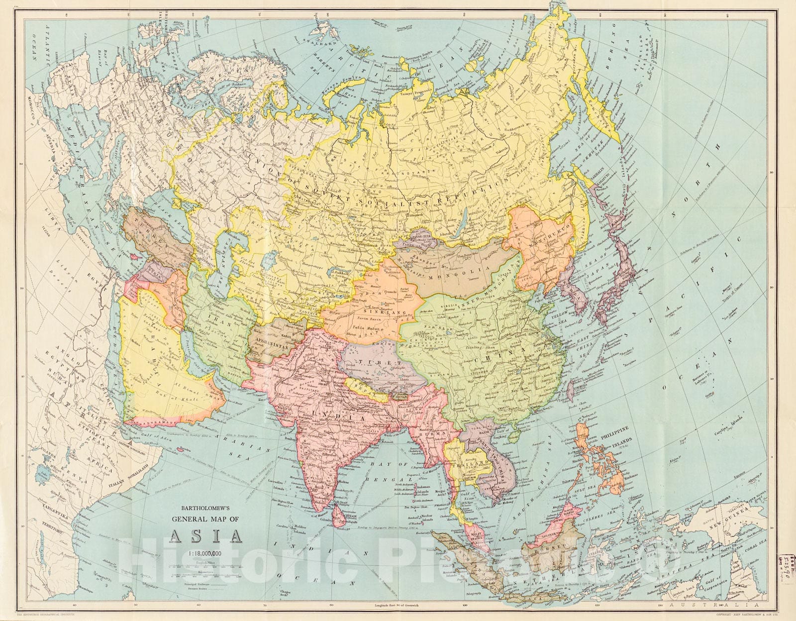 Historic 1940 Map Bartholomew’s General map of Asia. Historic